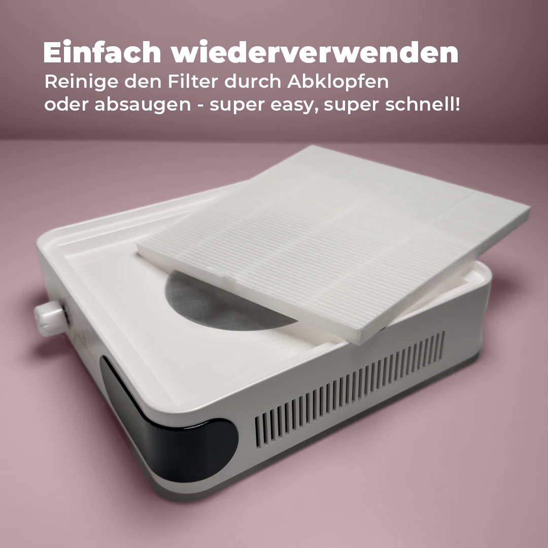 Der Filter ist unkompliziert entnehmbar und einfach zu reinigen. Ob durch Abklopfen oder Absaugen – in wenigen Schritten ist das Gerät wieder einsatzbereit. Das spart Zeit und macht die Wartung nicht nur angenehm und einfach, sondern auch kosteneffizient!