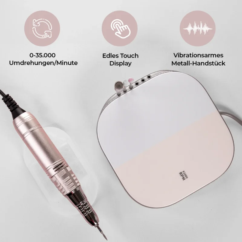 Das benutzerfreundliche Touch-Display des Fräsers ermöglicht dir die einfache Steuerung der Geschwindigkeit und Drehrichtung. Kombiniert mit dem kompakten und modernen Design in Silber/Rosé ist dieser Fräser nicht nur praktisch, sondern auch optisch ein Highlight.