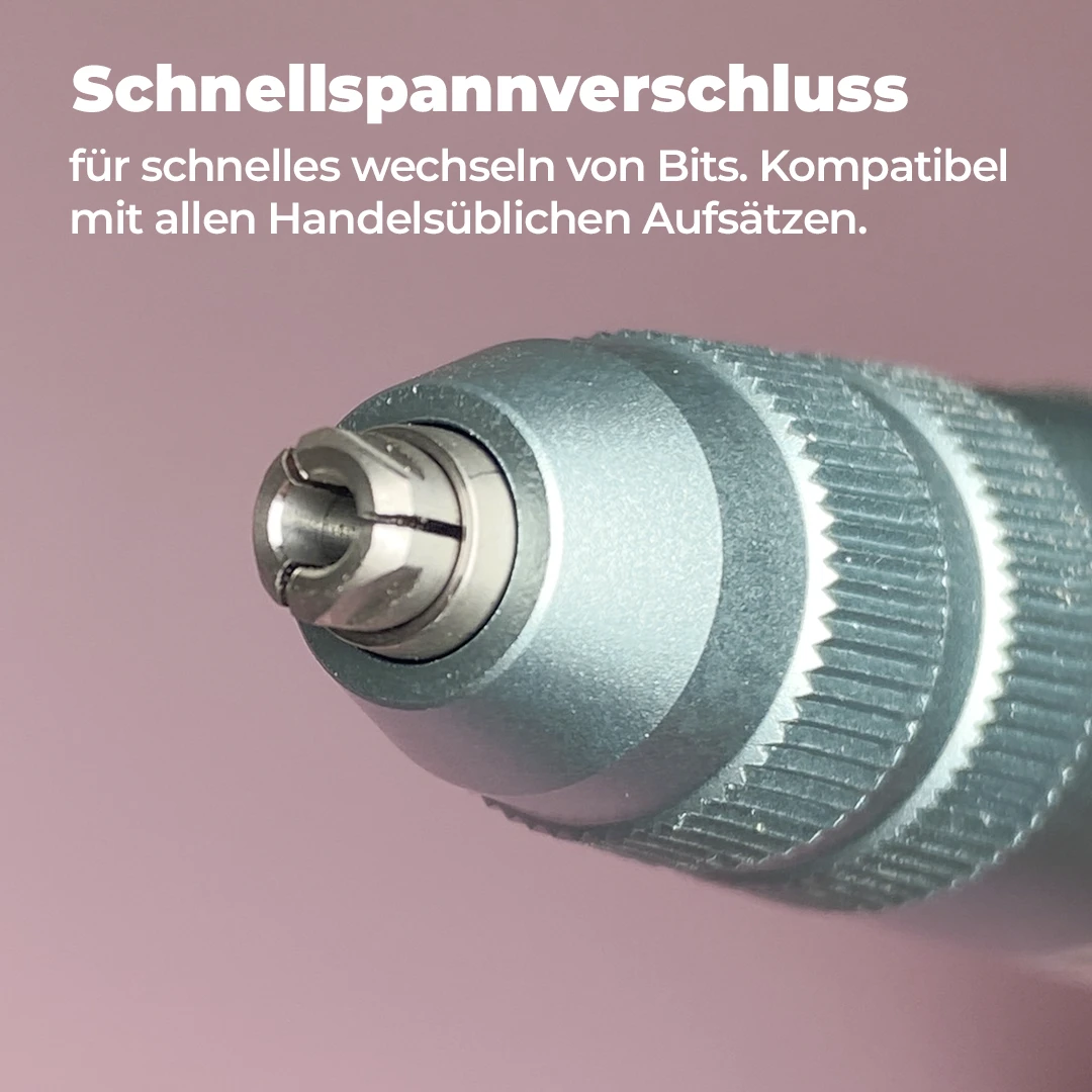 Mit dem genormten Schaftdurchmesser ist dieses Handstück mit allen handelsüblichen Bits kompatibel. Das Wechseln deiner Fräser Aufsätze klappt dank Schnellspannverschluss im Nu.