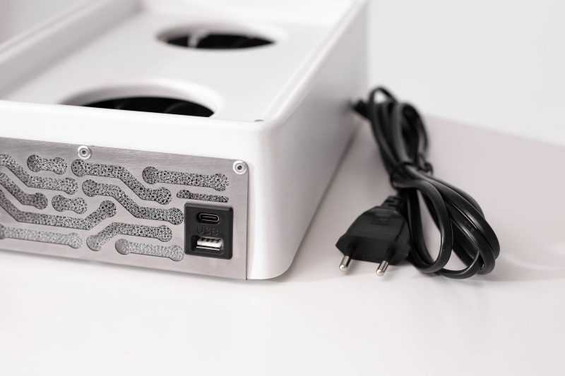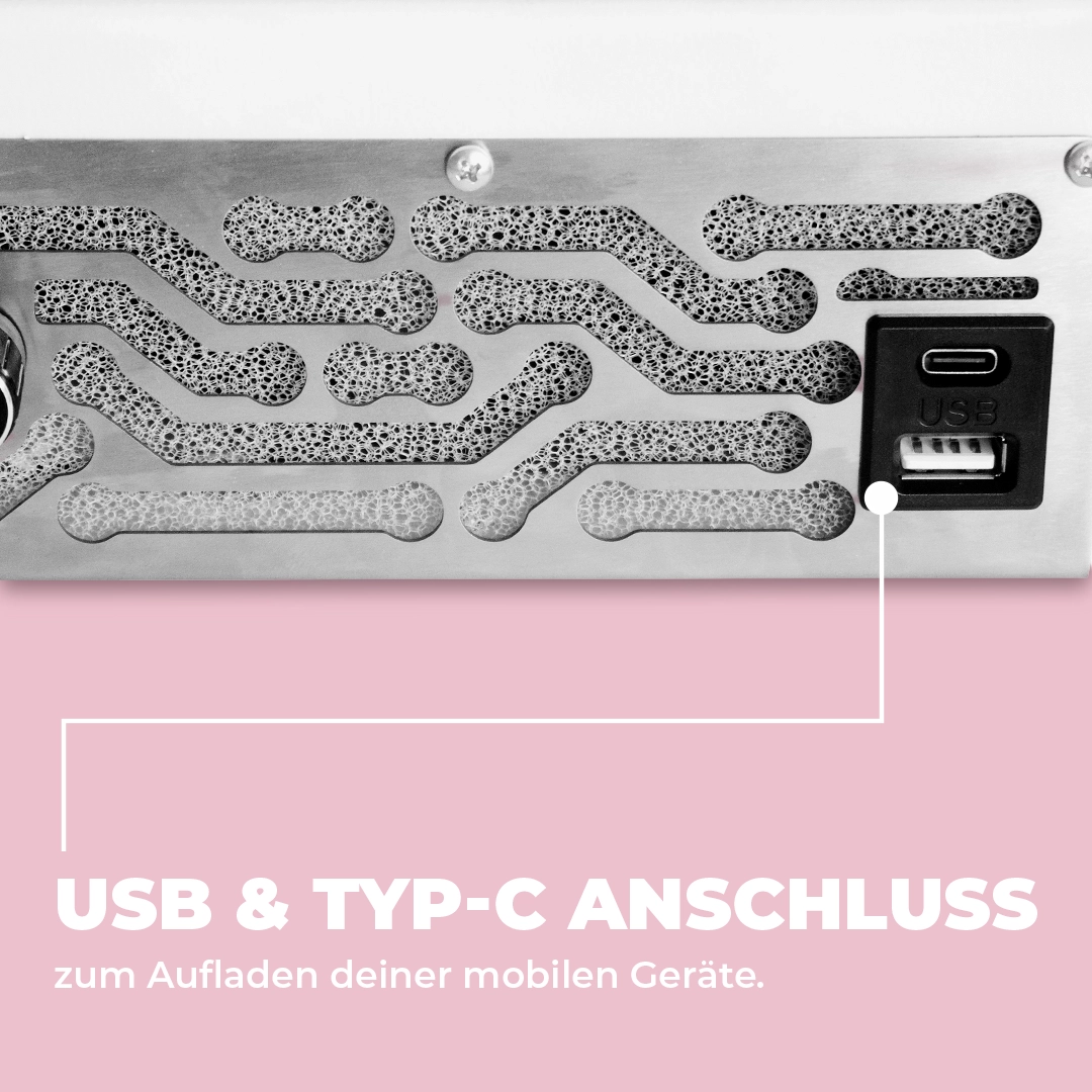 Mit 2 integrierten Ladeanschlüssen (USB & Typ‑C) kannst du deine mobilen Geräte direkt an der Staubabsaugung aufladen. Keine lästige Suche nach freien Steckdosen mehr – alles, was du brauchst, bleibt griffbereit an einem Ort. Das sorgt für einen flüssigen Arbeitsablauf und mehr Komfort am Nageltisch.