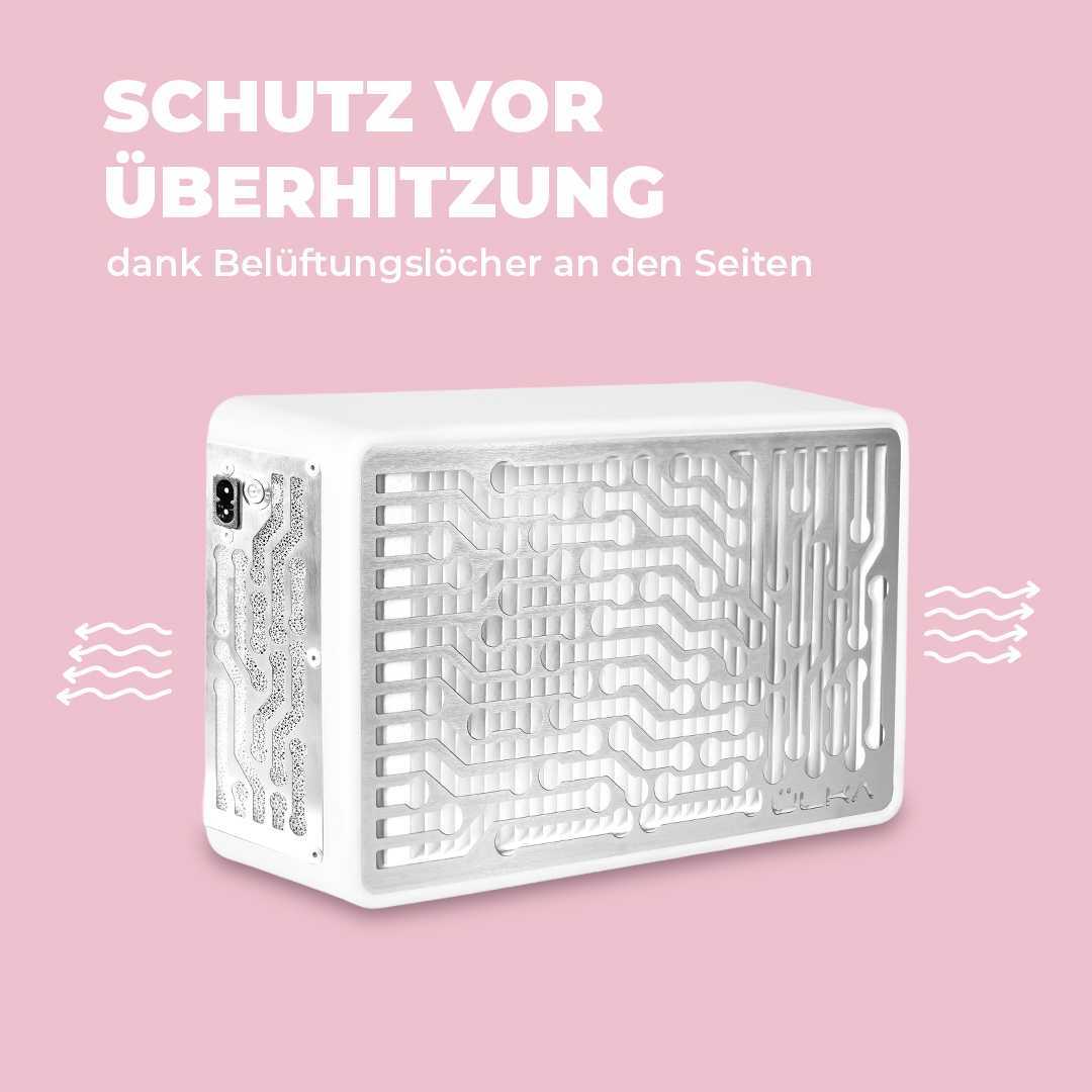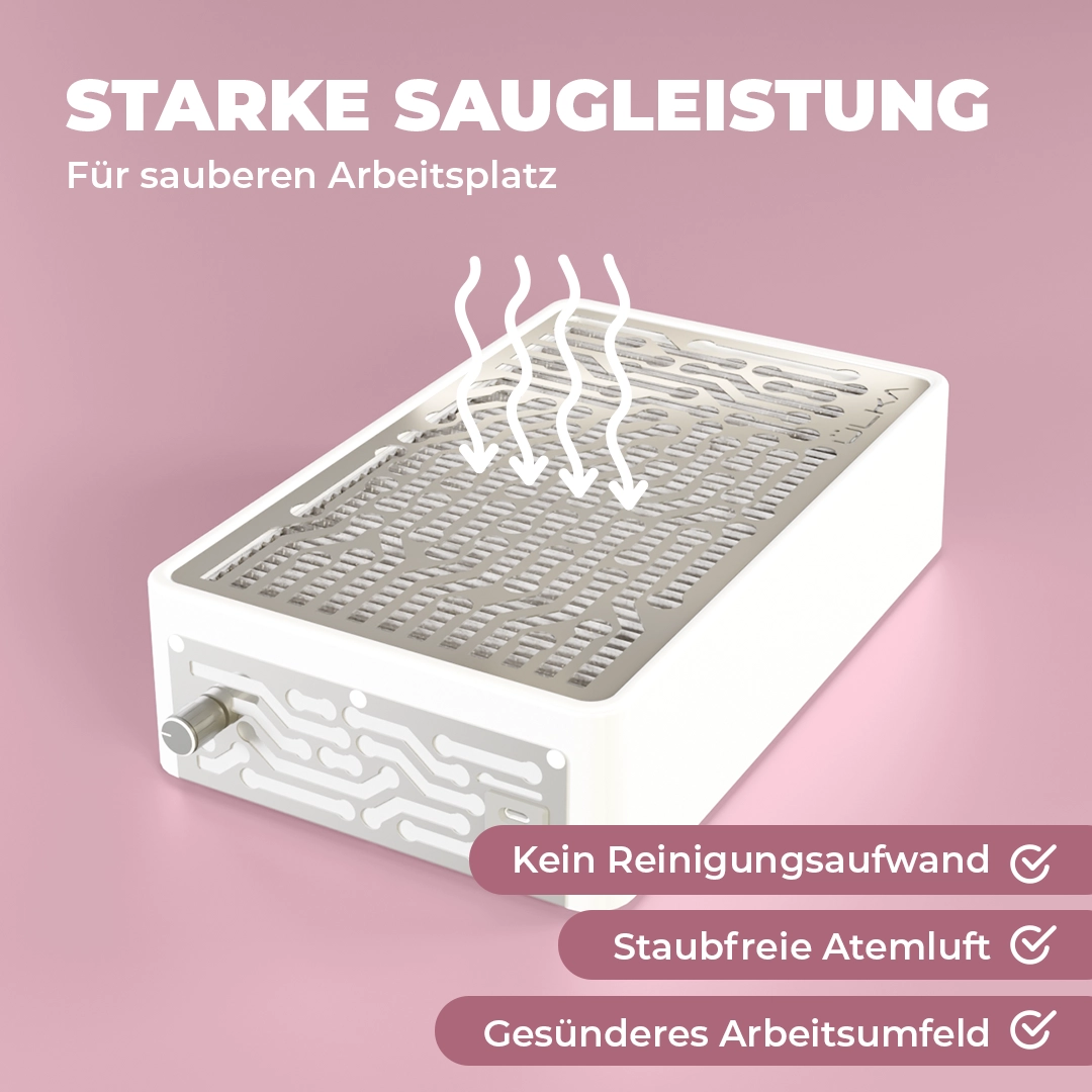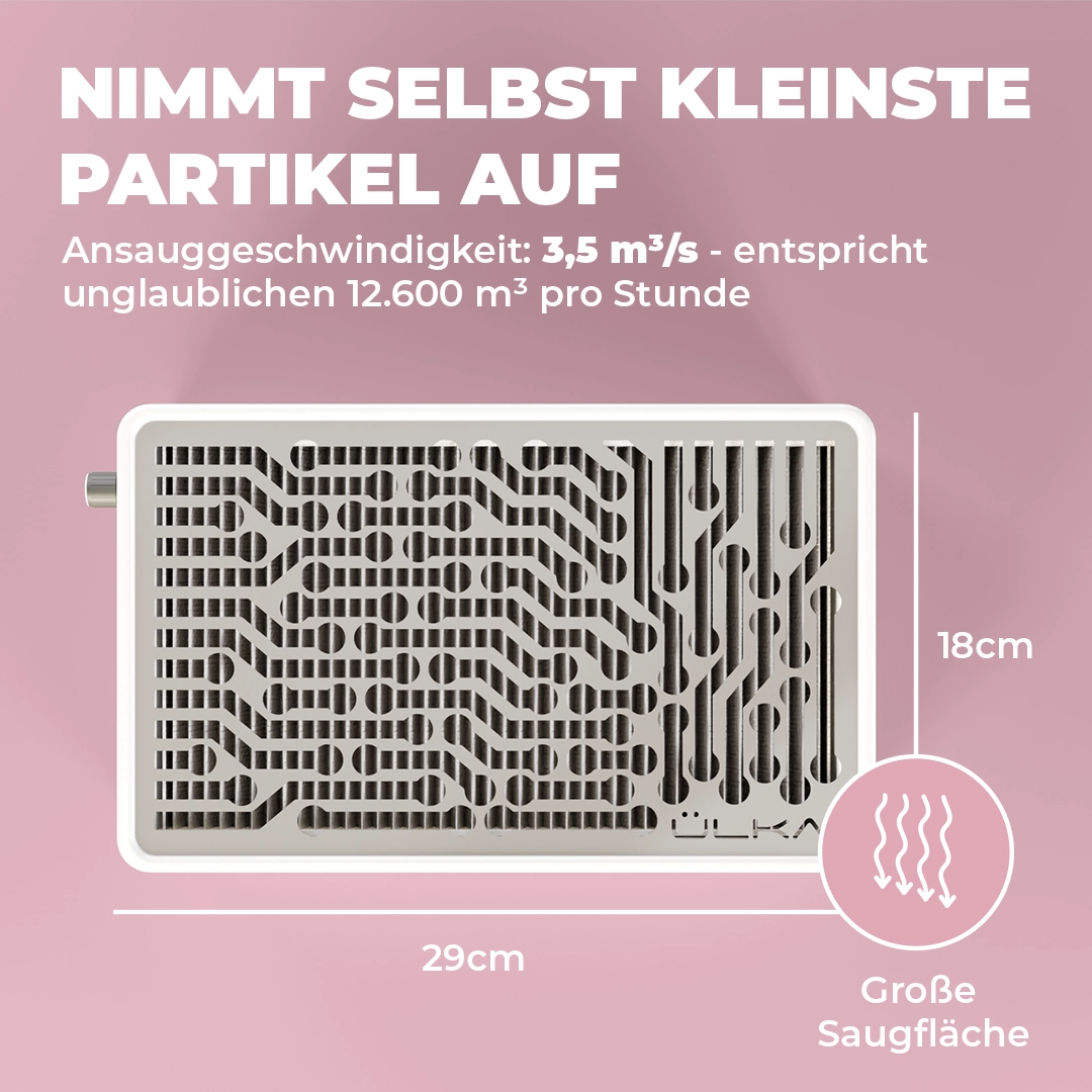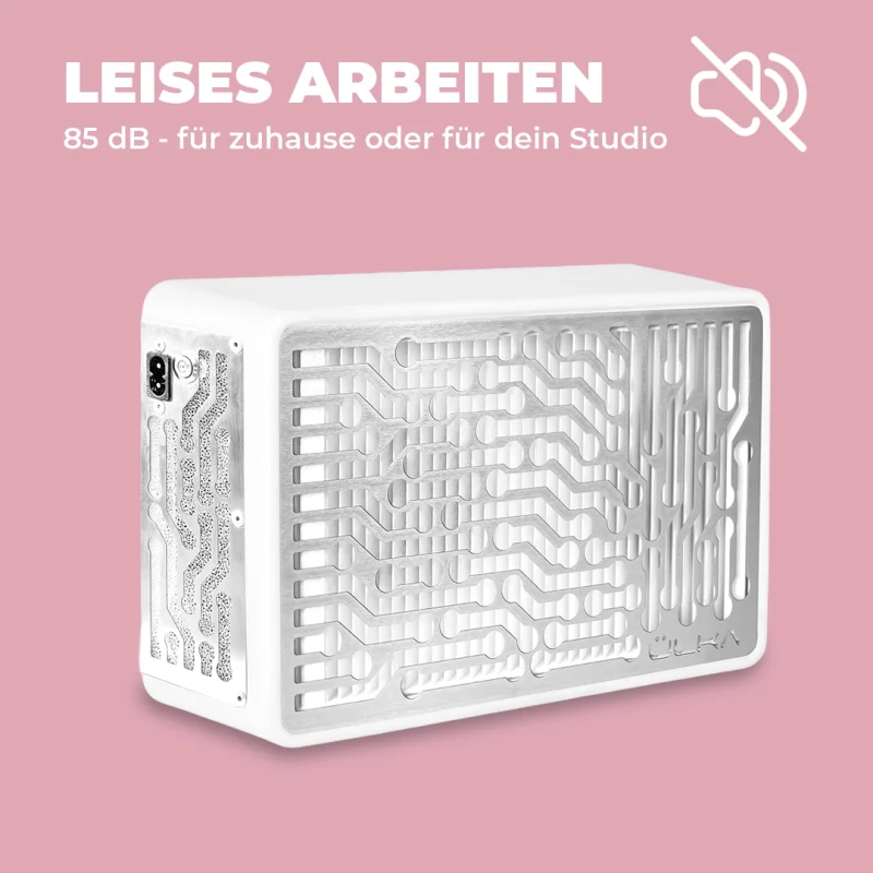 Die Staubabsaugung ÜLKA – Nano sorgt für einen sauberen Arbeitsplatz, indem sie Feilstaub besonders effizient einsaugt – egal, ob zu Hause oder im Studio. So bleibt die Atemluft frei von Staubpartikeln, und aufwendiges Reinigen gehört der Vergangenheit an. Besonders vorteilhaft für die Gesundheit von Nageldesigner/-innen, die täglich mit Feilstaub arbeiten!