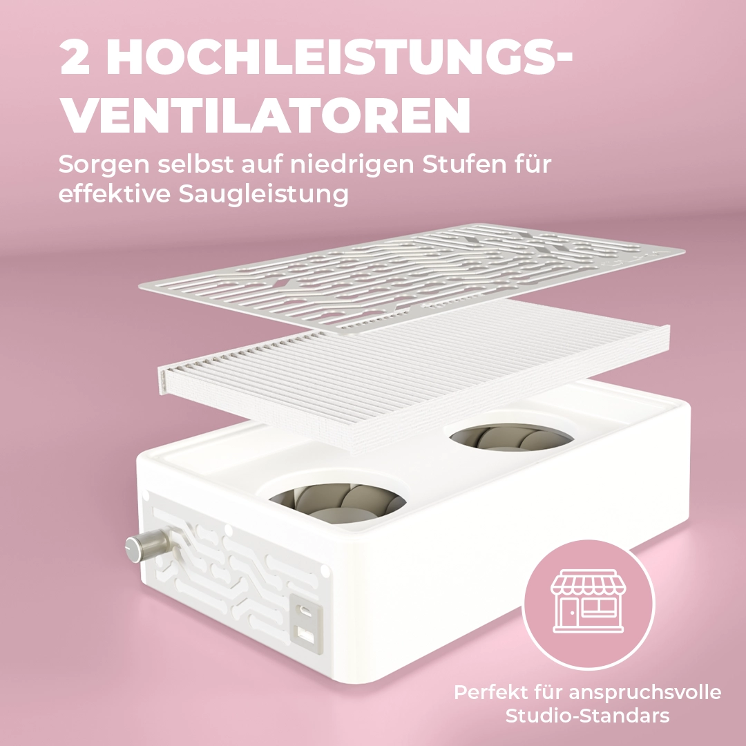 Im Gegensatz zu klassischen Staubabsaugungen arbeitet dieses Premium-Gerät gleich mit 2 Hochleistungs-Ventilatoren. Die Power ist so stark, dass selbst auf niedrigeren Stufen eine beeindruckend effektive Saugleistung erreicht wird. Sie ist perfekt für lange Arbeitstage und anspruchsvolle Studio-Standards.