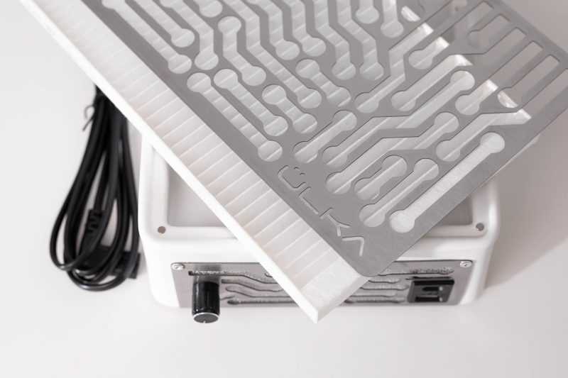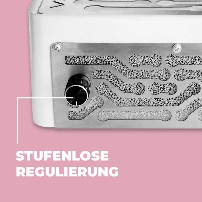 Mit dem Drehknopf der Staubabsaugung ÜLKA – Nano kannst du die Saugleistung präzise und stufenlos an deinen Arbeitsschritt anpassen. Eine niedrige Stufe für die Maniküre oder volle Power für grobe Feilarbeiten.