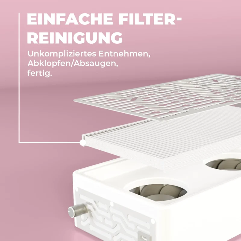 Der Filter ist unkompliziert entnehmbar und einfach zu reinigen. Ob durch Abklopfen oder Absaugen – in wenigen Schritten ist das Gerät wieder einsatzbereit. Das spart Zeit und macht die Wartung nicht nur angenehm und einfach, sondern auch kosteneffizient!