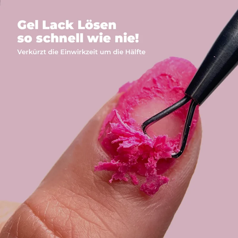 Ganz einfach! Unser spezieller Gel Lack Löser hilft dir dabei. Alles, was du tun musst, ist die Gel Lack Oberfläche mit einer gröberen Feile anrauen, etwas Gel Lack Löser auf ein Pad geben und es gut am Nagel befestigen. Nach ca. 7 Minuten Einwirkzeit lässt er sich dann mühelos mit dem speziellen Gel Lack Remover Tool sanft vom Naturnagel schieben.
