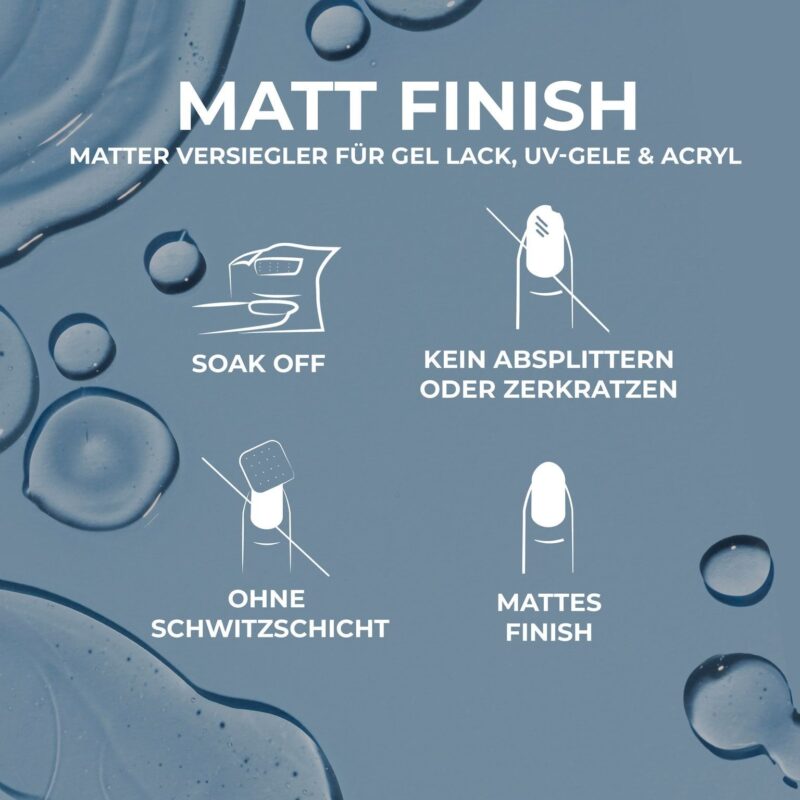 Der Gel Lack Matt Finish – No Wipe kann flexibel über Gel Lack, Gel, Acrylgel oder Acryl angewendet werden.