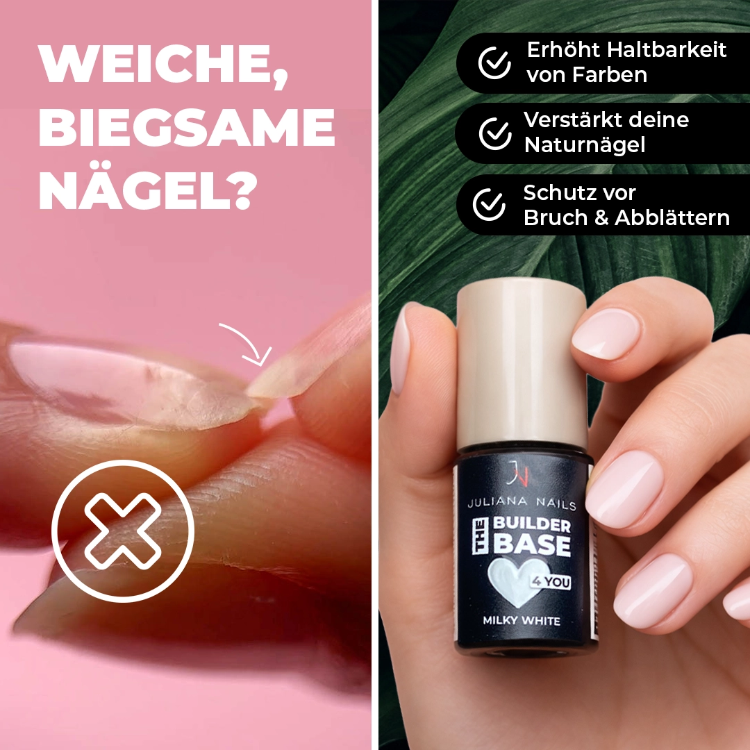 Unser The Builder Base bietet dir eine stabile Grundlage, selbst wenn deine Nägel von Natur aus weich oder biegsam sind. Es erhöht die Haltbarkeit deiner Gel Lack Farben und schützt vor Bruch und Abblättern.