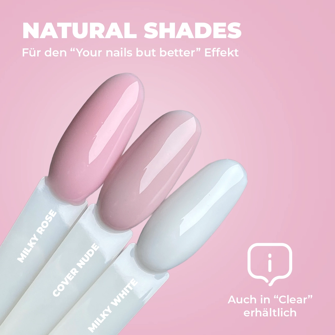 Unser Gel Lack 4 YOU – The Builder Base gibt es in vielen wunderschönen, natürlichen Farbnuancen. Von transparent über natürliches Nude-Rosa bis hin zu Milky White – [hier] ist für jeden Stil etwas dabei. Du kannst die Farben alleine tragen, um einen zarten, natürlichen Look zu zaubern, oder sie als perfekte Basis für deine [Gel Lack Farben] verwenden.