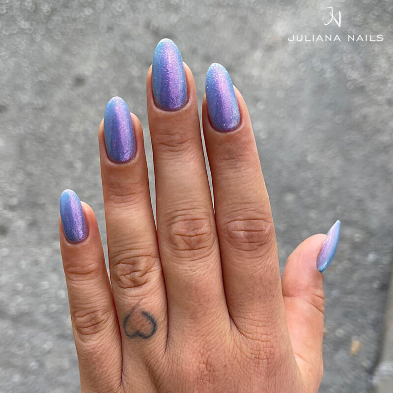 Unser Gel Lack Aurora Harp Shell in funkelndem Violett ist inspiriert von der schimmernden Oberfläche einer Muschel. Er ist veredelt mit einem schimmernden Aurora Effekt in Lila und Gold.