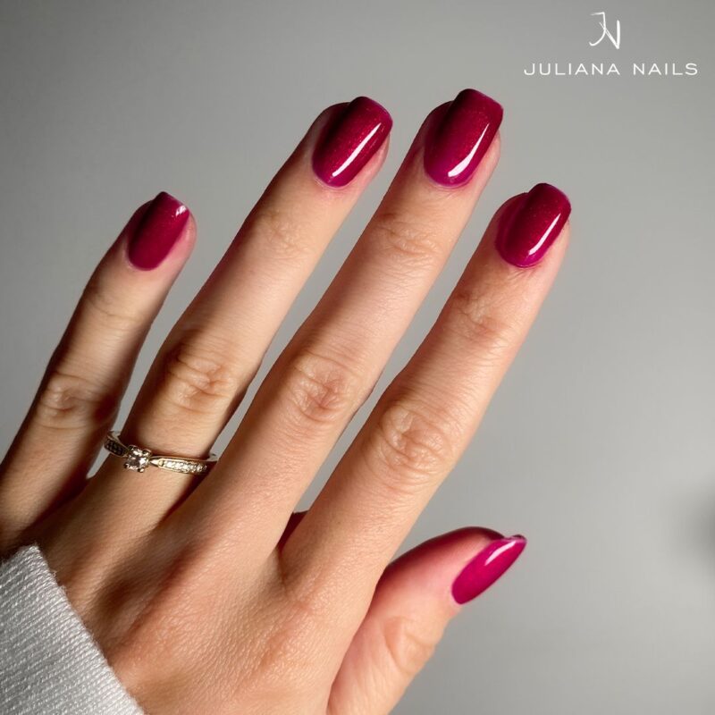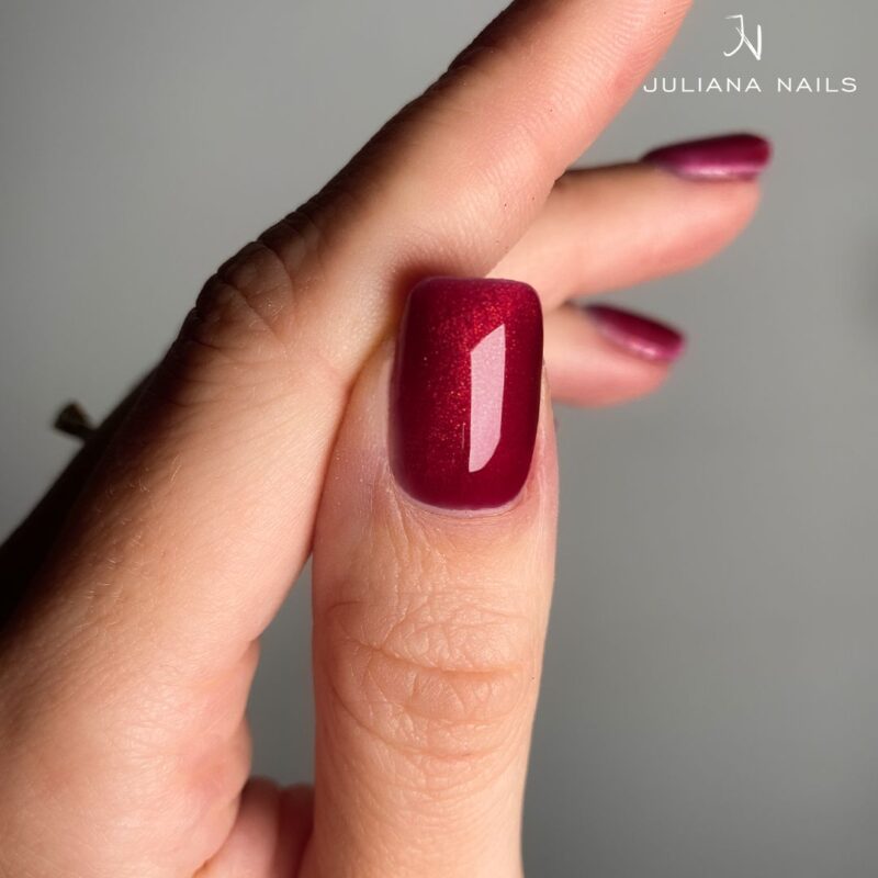 Unser Gel Lack Cat Eye Ember Embrace ist ein Dunkelrot mit pinkem Unterton und funkelnden Schimmerpigmenten in strahlendem Kirschrot.