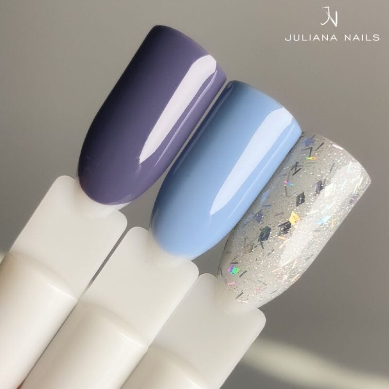 Der Gel Lack Cool Sky mit feinstem Glitter und kleinen Flakes in Holo-Silber erinnert an die funkelnde Schönheit von Eis und Schnee.
