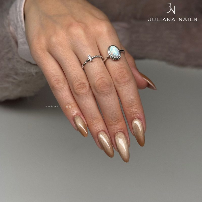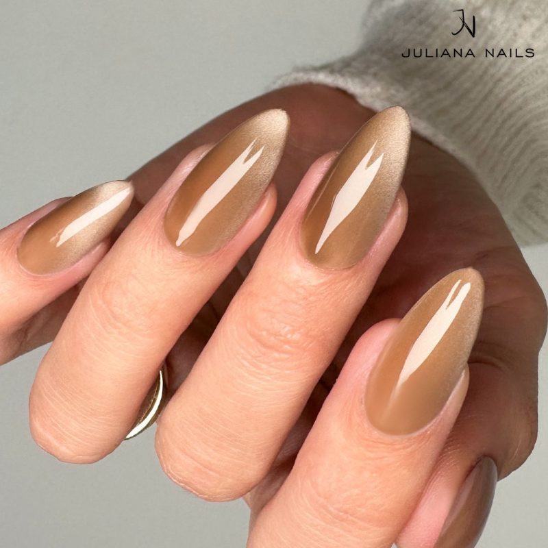 Unser Gel Lack Cat Eye Galaxy Latte ist ein sanftes Braun mit hauchzarten, braun schimmernden Pigmenten.