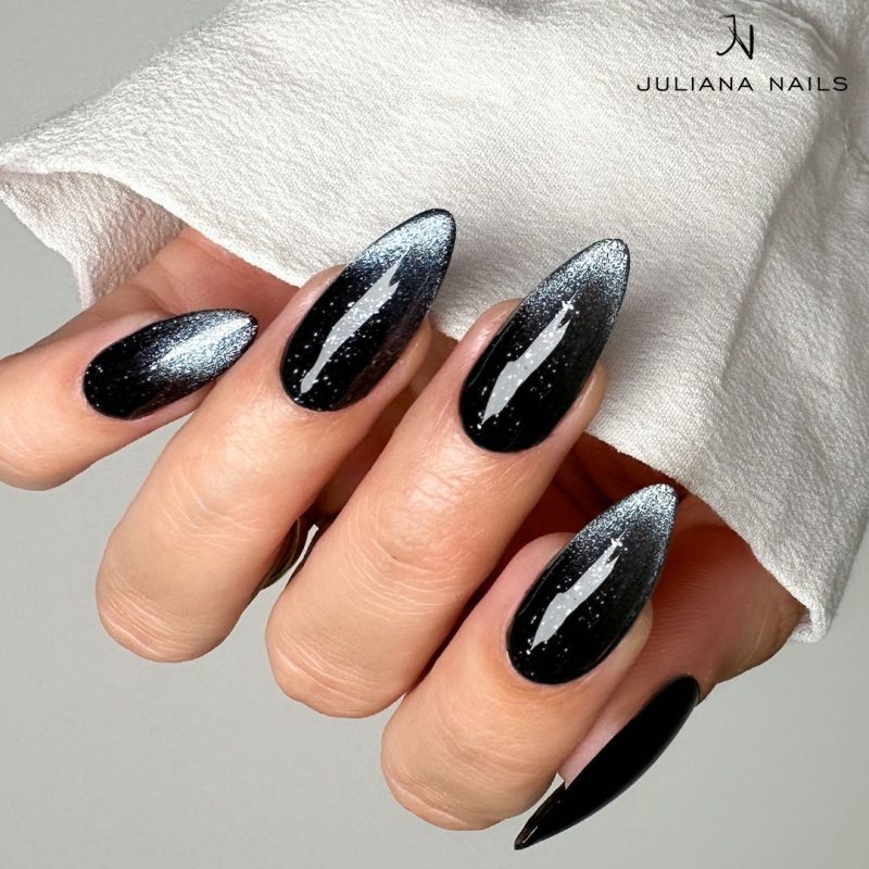 Unser Gel Lack Cat Eye Gravity Glaze ist ein geheimnisvolles Dunkelblau mit zarten, jeansblau schimmernden Pigmenten.