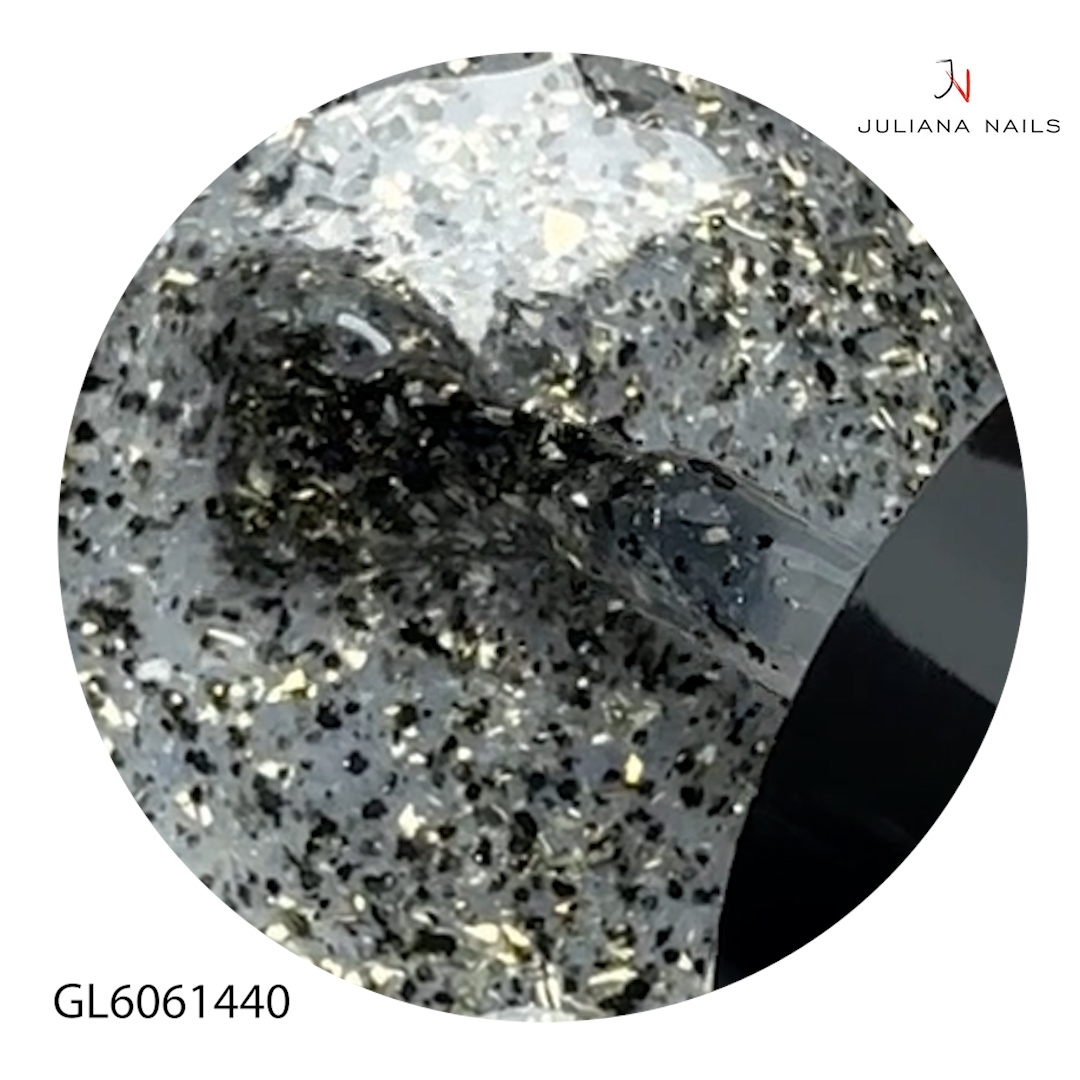 Unser Gel Lack Jelly Whirl ist transparent mit feinem Glitter, Flakes und Fäden in Gold und Schwarz.