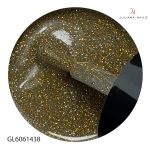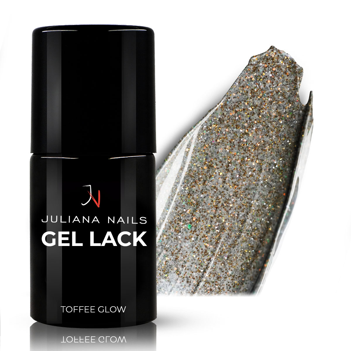 Unser Gel Lack Toffee Glow ist ein kühles Gold-Glitter mit silbernen und rosafarbenen Akzenten.