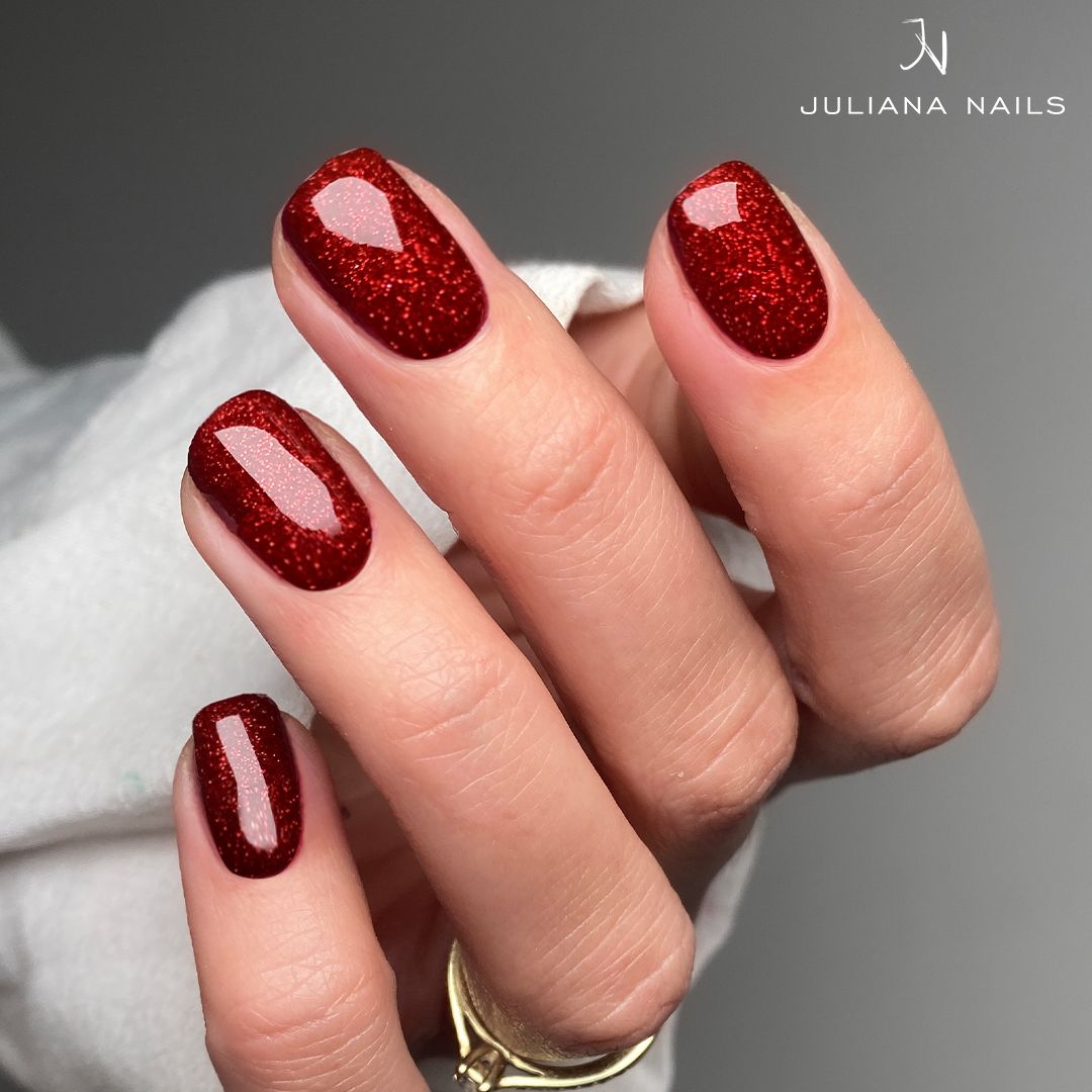 Unser Gel Lack Guiding Light ist ein etwas dunkleres Rot, das mit strahlendem, rotem Glitter festlich funkelt.