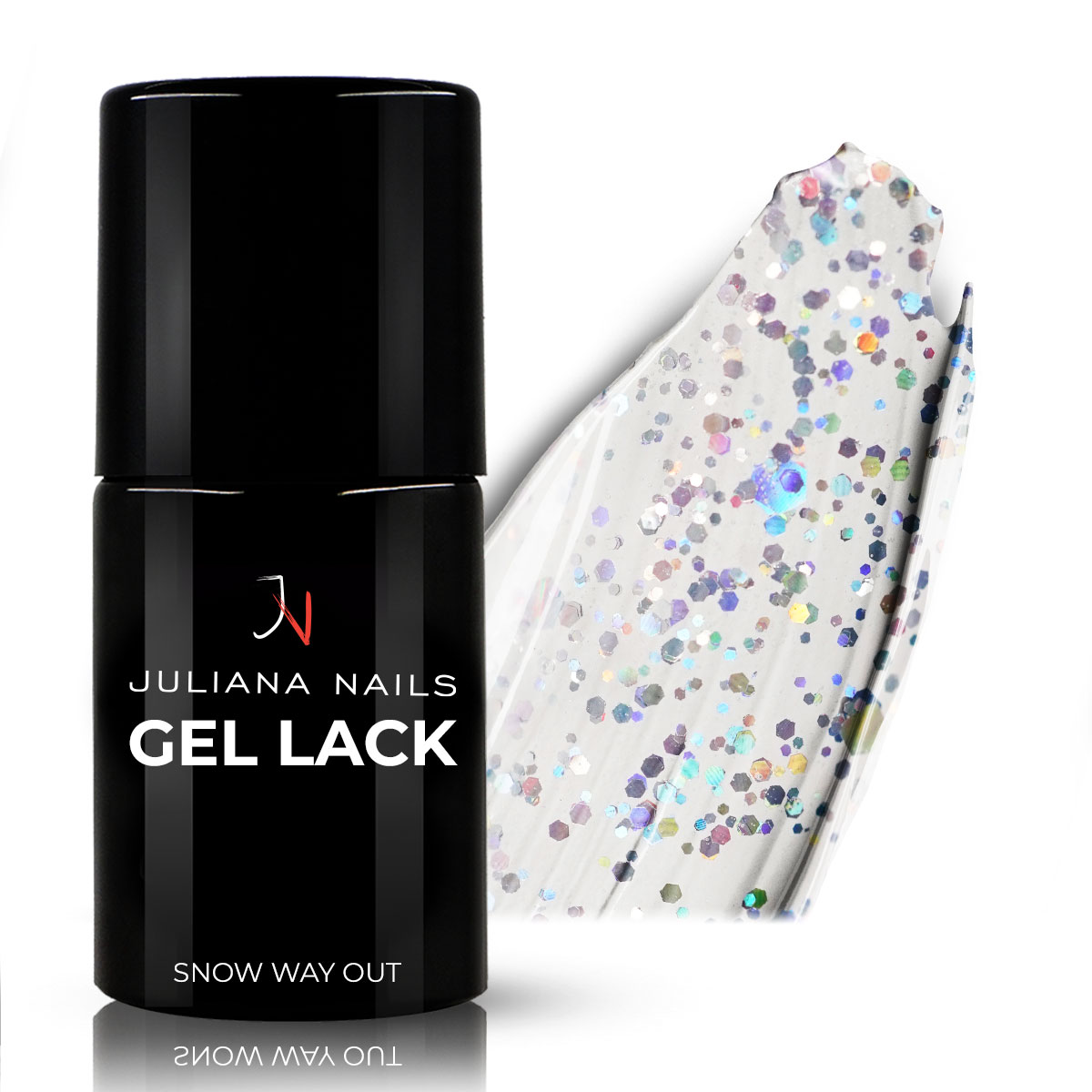 Unser Gel Lack Snow Way Out ist ein holografisches Silberglitter mit funkelnden Pailletten – wie tanzende Schneeflocken im Licht.
