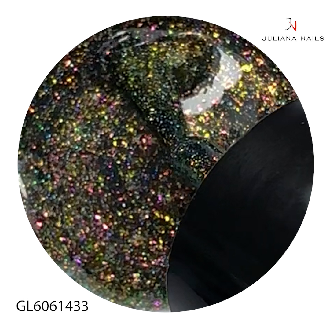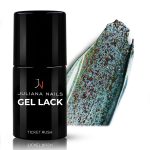 Unser Gel Lack Ticket Rush ist ein faszinierender Mix aus Glitter in Gold, Violett, Schwarz und Grün.