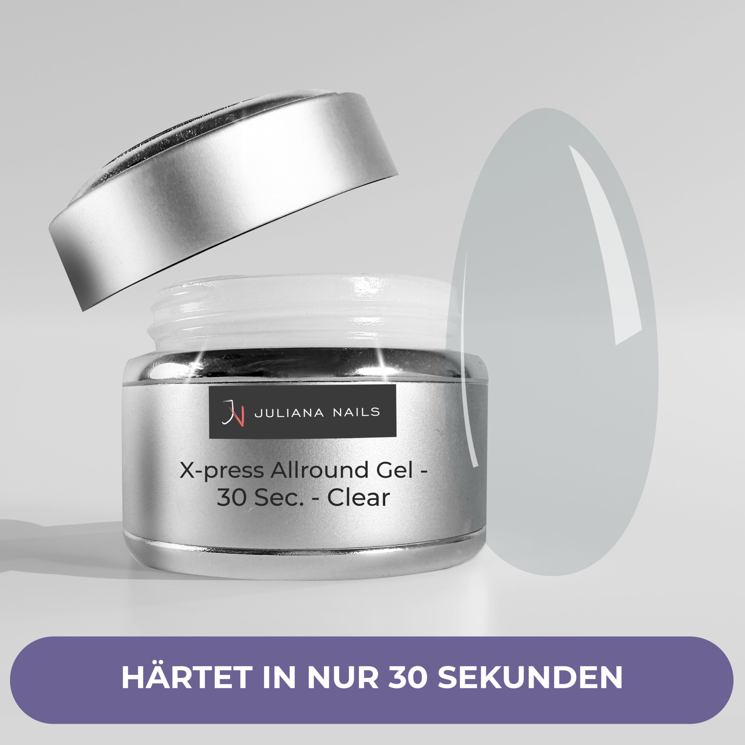 Unsere X-press Allround Gele – 30  Sec. sind ein wahrer Game-Changer, denn sie härten in Rekordzeit! Das bedeutet für dich: Weniger Zeit am Nageltisch und mehr Zeit, deine wunderschönen Nägel zu genießen.