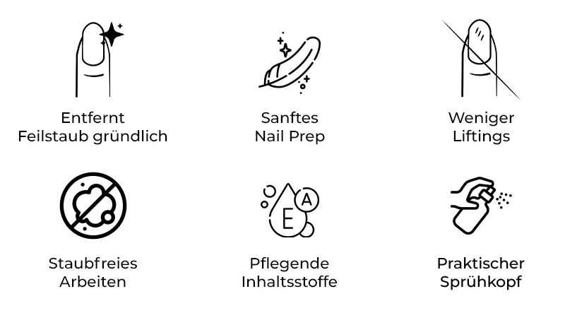 Dieses Reinigungsspray entfernt zuverlässig Feilstaub vom Nagel und aus den Nagelrändern. Das ist entscheidend, damit dein Material optimal haften kann und keine Staubreste ungewollt in Gel oder Gel Lack gelangen. Für sauberes Arbeiten und makellose Ergebnisse.