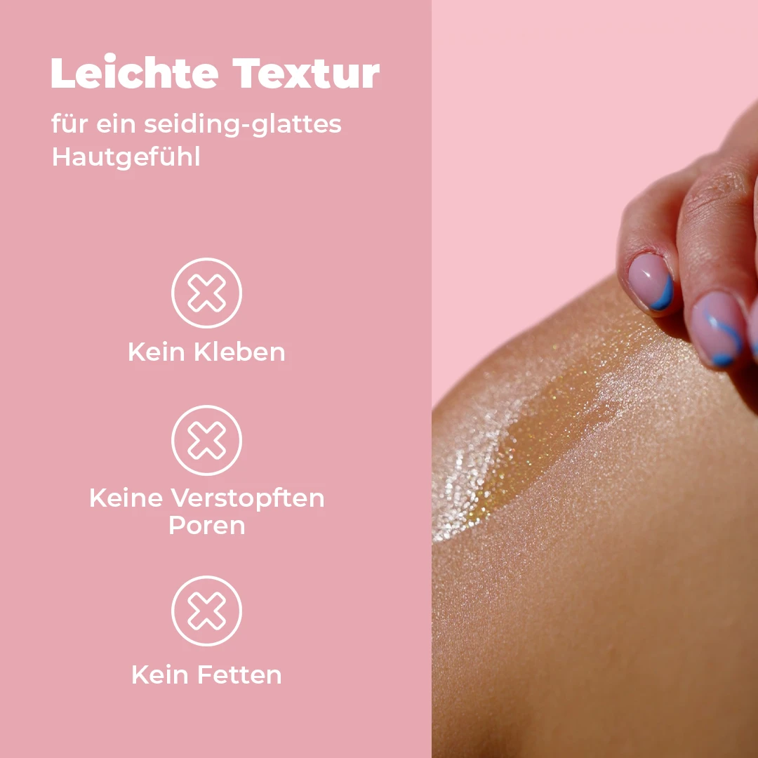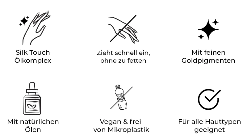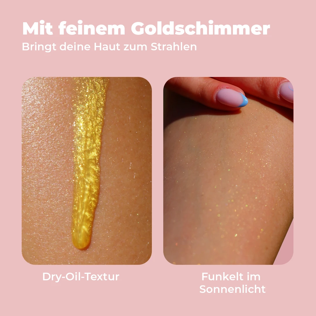 Trockenes Kรถrperรถl mit goldenen Schimmerpigmenten. Kein Fettfilm - kein Kleben. Mikroplastikfrei.