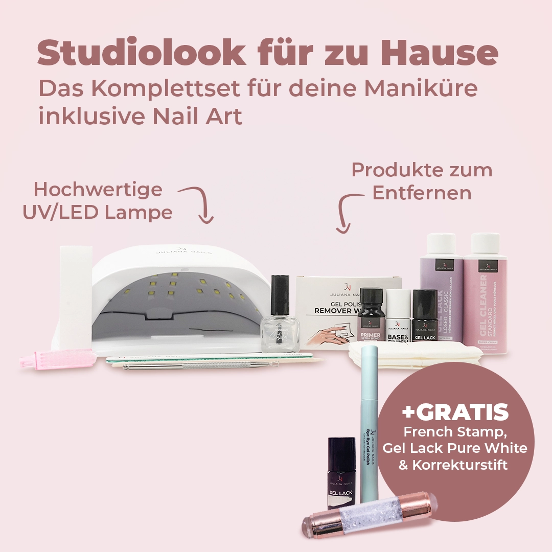 Unser Gel Lack Set – Classic in der French Edition enthält alle Produkte, die du für die Vorbereitung, Anwendung und Entfernung von Gel Lack benötigst inklusive UV/LED-Lampe. Obendrein enthält es alle Produkte, die du für ein wunderschönes French Design benötigst. Und das gratis!