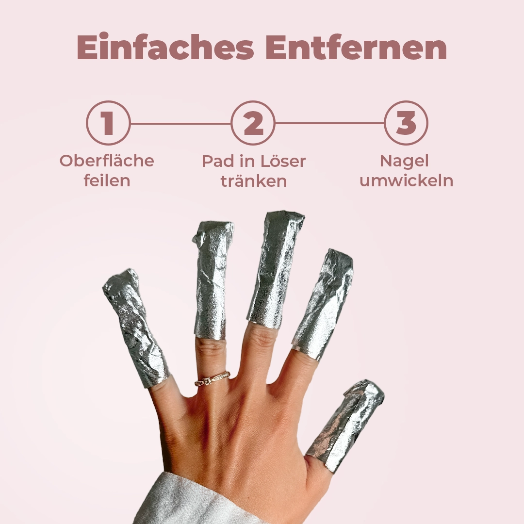 Möchtest du allerdings alles entfernen, hilft dir unser spezieller Gel Lack Löser dabei. Alles, was du tun musst, ist die Gel Lack Oberfläche mit einer gröberen Feile anrauen, etwas Gel Lack Löser auf ein Pad geben und es gut am Nagel befestigen. Nach ca. 15-20 Minuten Einwirkzeit lässt es sich dann mit einem Metall-Nagelhautschieber vom Naturnagel entfernen.