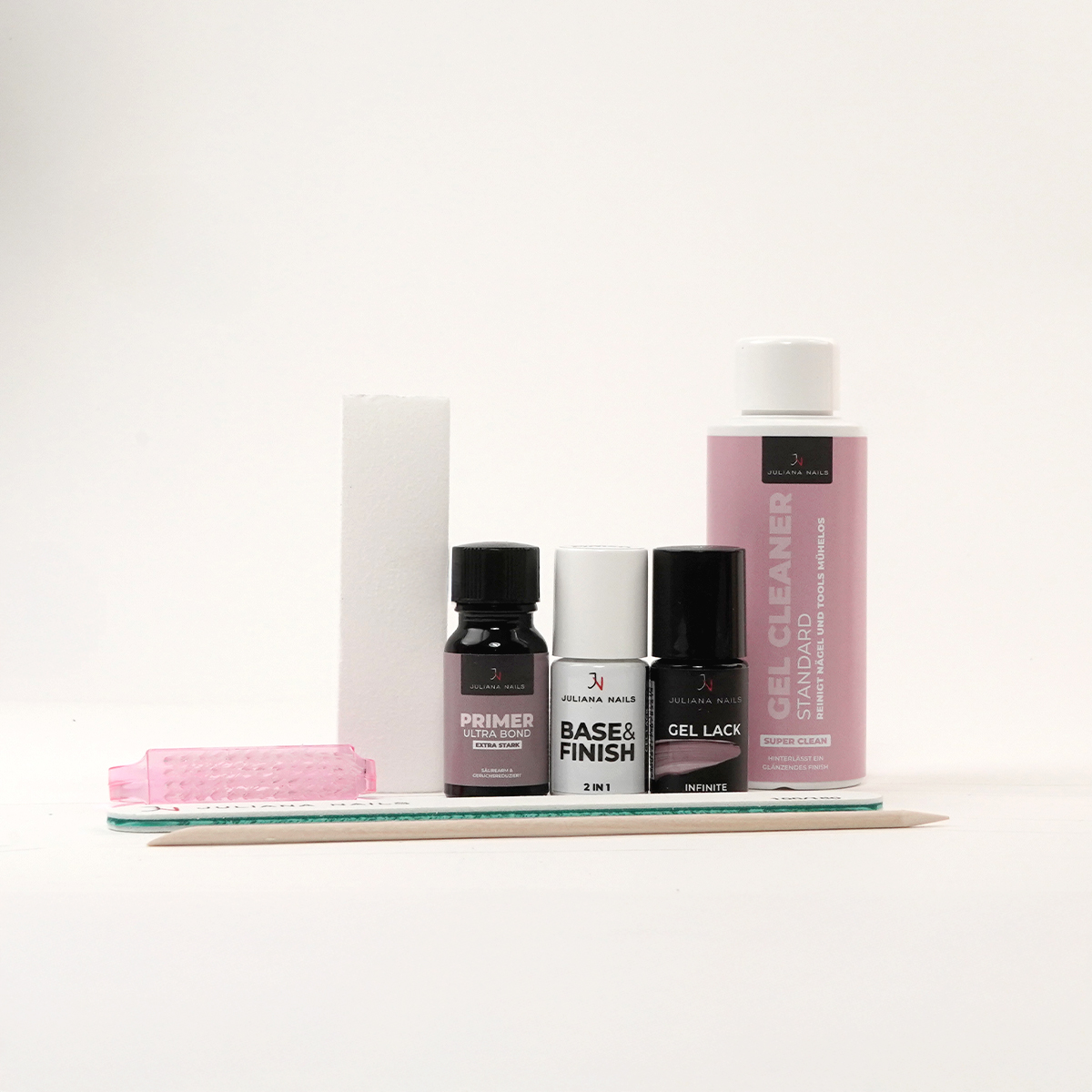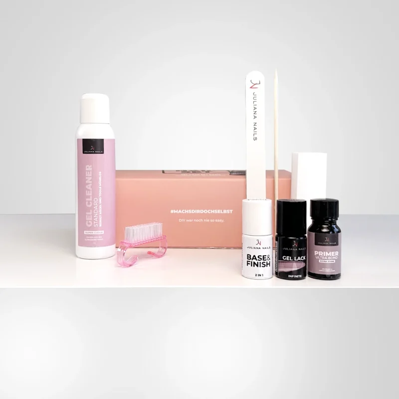 Mit diesem Set holst du dir das komplette Nagelstudio-Erlebnis direkt zu dir nach Hause. Es enthält alle Basic Produkte, um zuhause selbst für eine professionelle Gel Lack Maniküre und Pediküre zu sorgen, wie z.B. diverse Produkte zur Nagelvorbereitung, Base Coat, Top Coat und Farbe. Weil viele von euch schon eine Lampe zuhause haben (oder sich ihr Lieblingsmodell selbst aussuchen wollen), haben wir bewusst auf eine UV/LED-Lampe verzichtet.