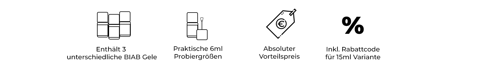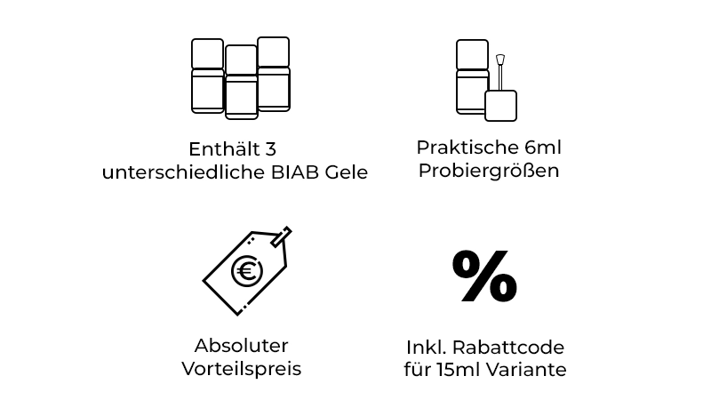 Das Try Me Set ist nicht nur praktisch, um dein neues Lieblings-BIAB-Gel zu finden, sondern auch ein echter Preishammer! Du sparst satte € 7,98 gegenüber dem Einzelkauf. Das sind über 27%! Cleverer geht’s nicht!