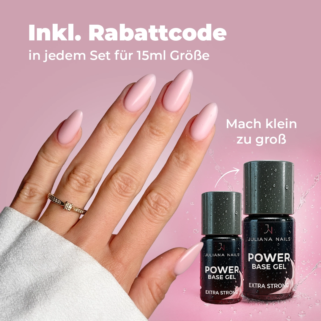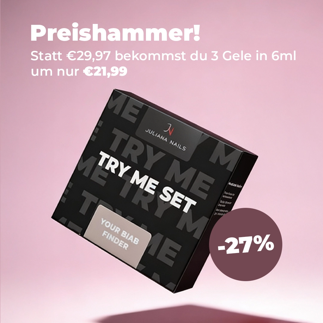Wenn du dein Lieblings-BIAB-Gel gefunden hast, bekommst du mit dem Try Me Set gleich den passenden Rabattcode dazu. Damit kannst du beim Kauf der großen Flasche gleich nochmal sparen – online oder in jeder Juliana Nails Filiale. Noch ein Grund mehr, zu testen!