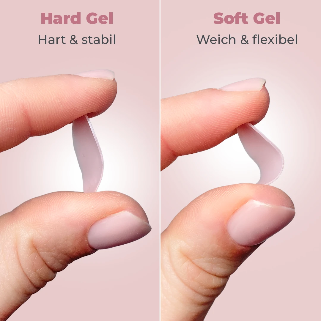 Soft Gel ist flexibler, ideal für natürliche BIAB Looks und kann meist mit Gel Lack Löser entfernt werden.